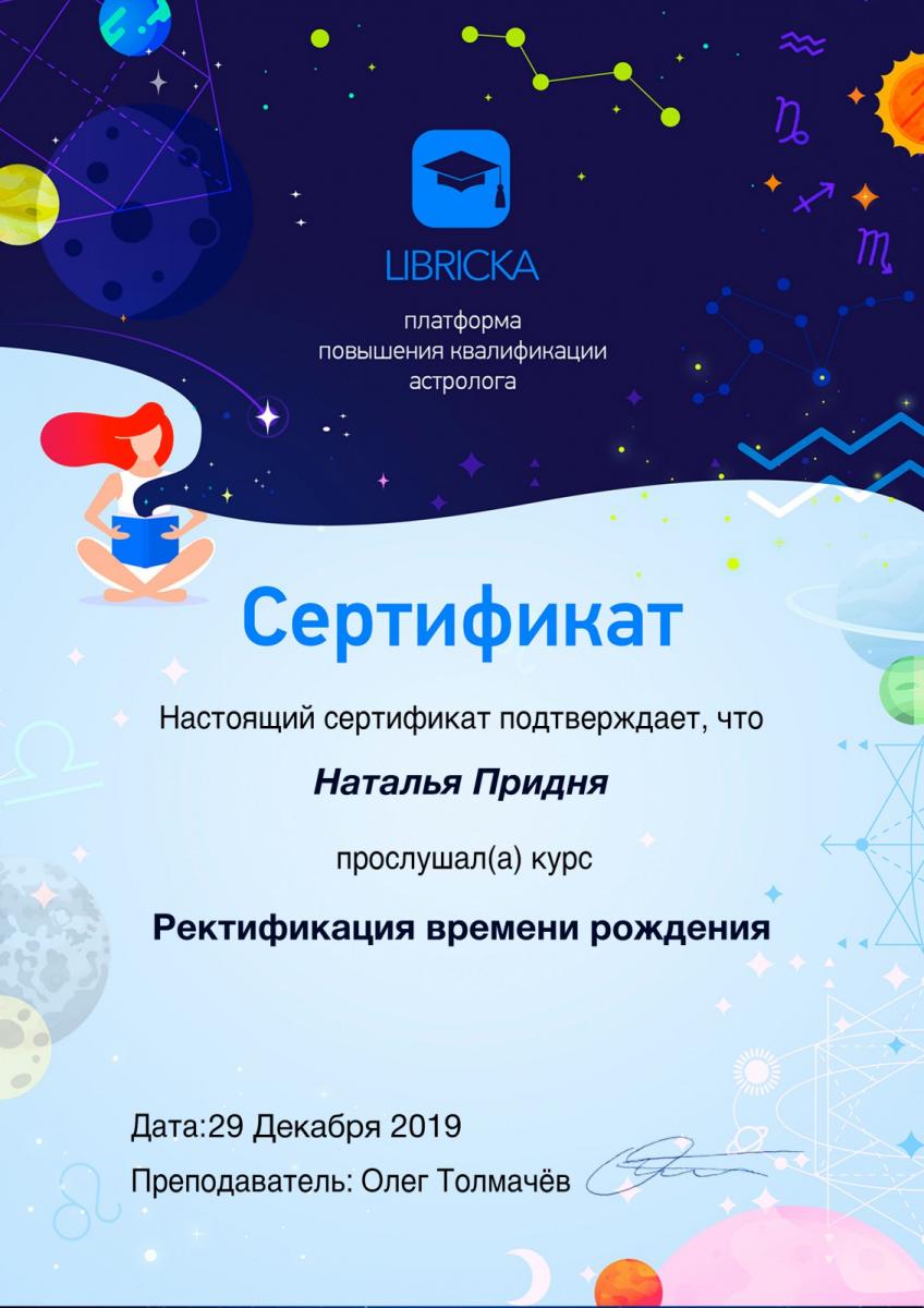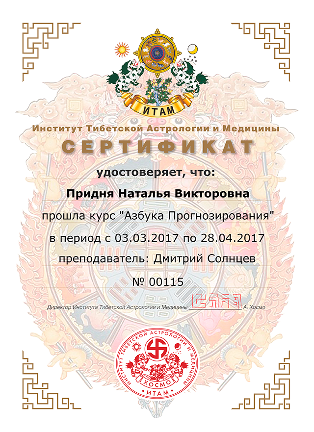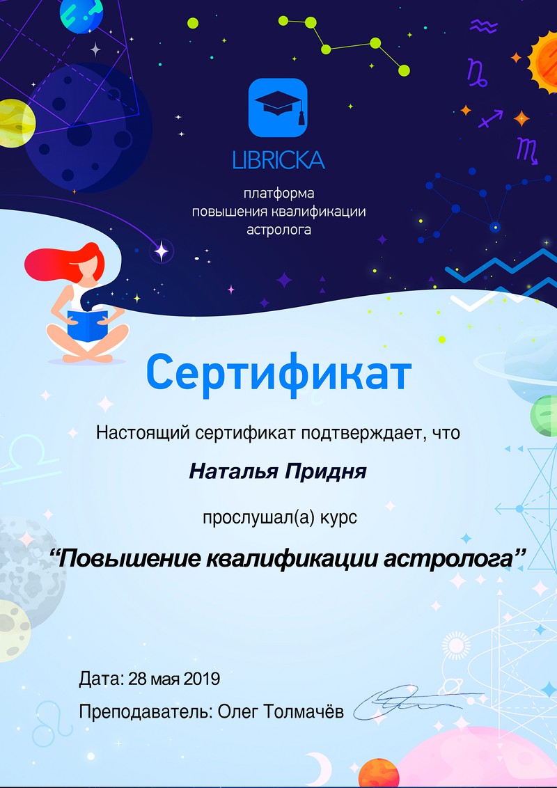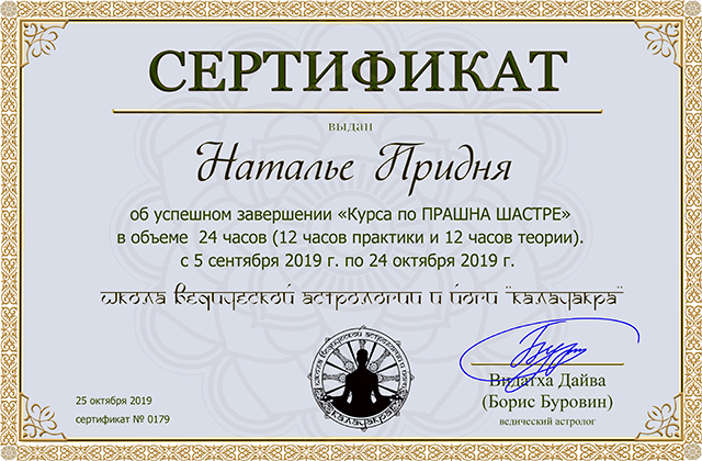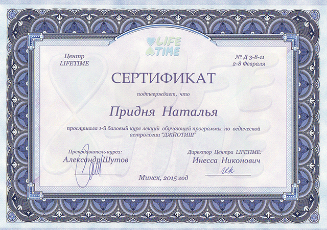 Здравствуйте, меня зовут Наталья Придня. Я профессиональный ведический астролог Джйотиш. Живу и работаю в Минске. Имею многолетний опыт консультирования и преподавания ведической астрологии. Провожу постоянные занятия в Школе ведической астрологии на базе центра LIFETIME.